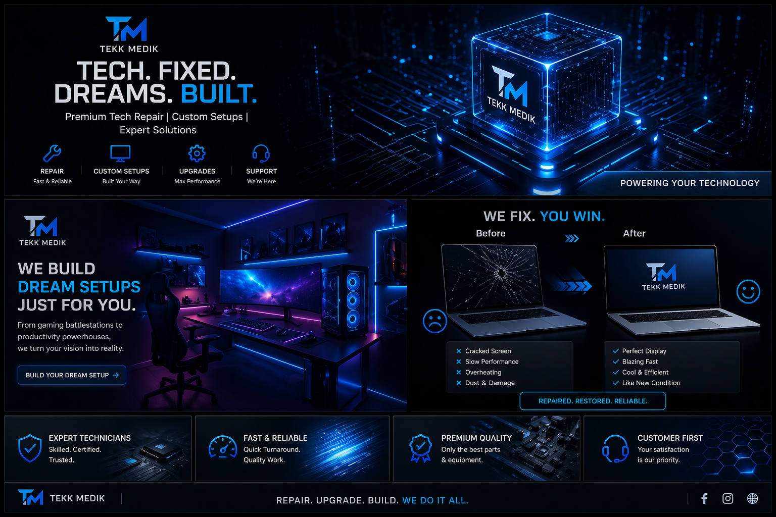 Your all-in-one technology solution. From websites and social media to custom setups and electronic repair — we turn your ideas into real, working systems.